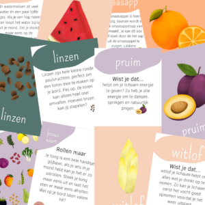 Zodra deze kaartjes op tafel liggen, kan het avontuur beginnen! Tijdens de maaltijd wordt je kind (en jij) uitgedaagd om groente en fruit te proeven. De tafelkaartjes dragen bij aan een ontspannen sfeer, grappige momenten én gezelligheid aan tafel.