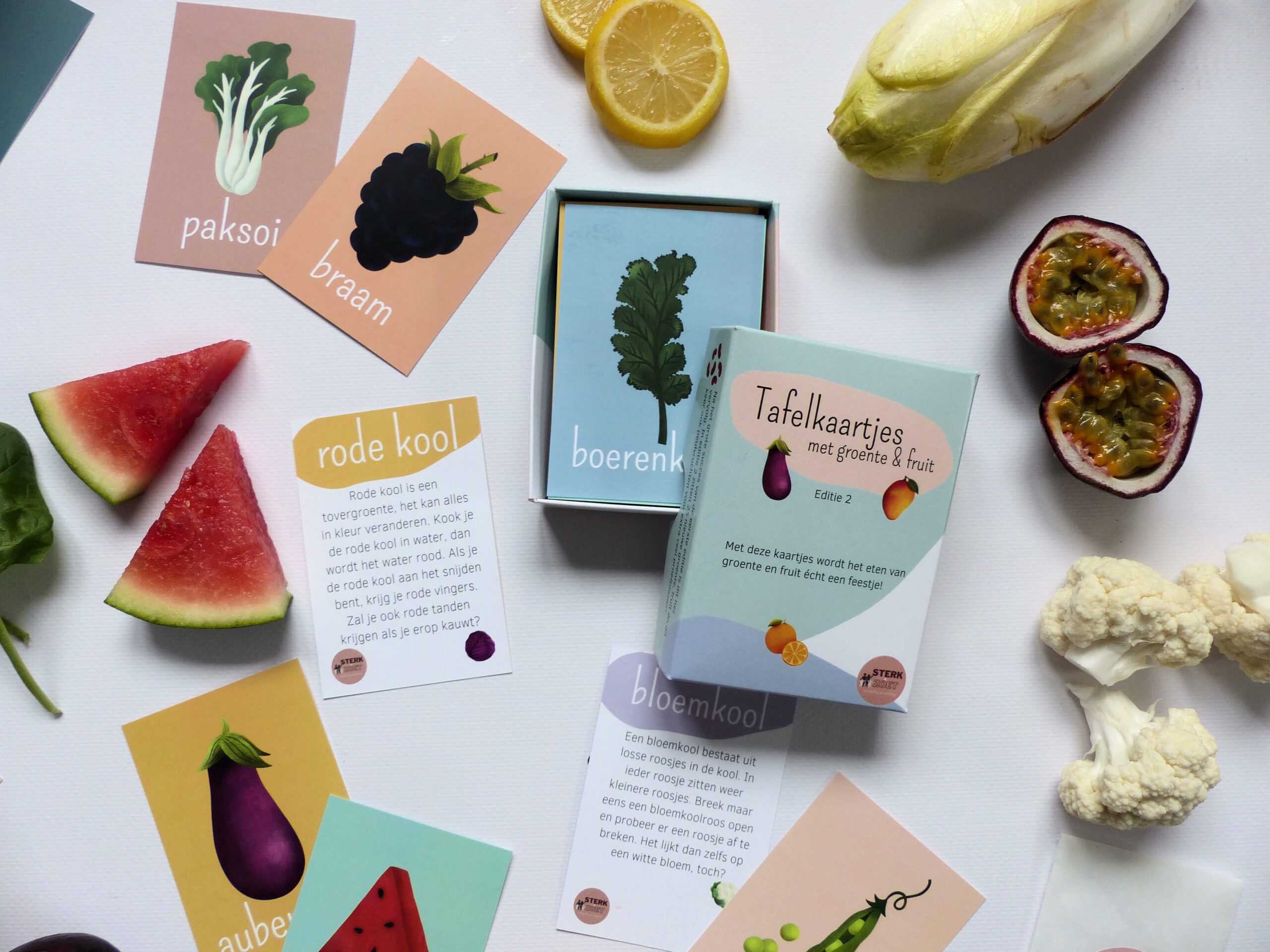 In het doosje vind je vijftig groente- of fruitkaartjes en tien bonuskaartjes. Maar ook een downloadbaar proefwerkblad en een zakje stickers om kinderen te inspireren om groente en fruit nog leuker en lekkerder te laten zijn.